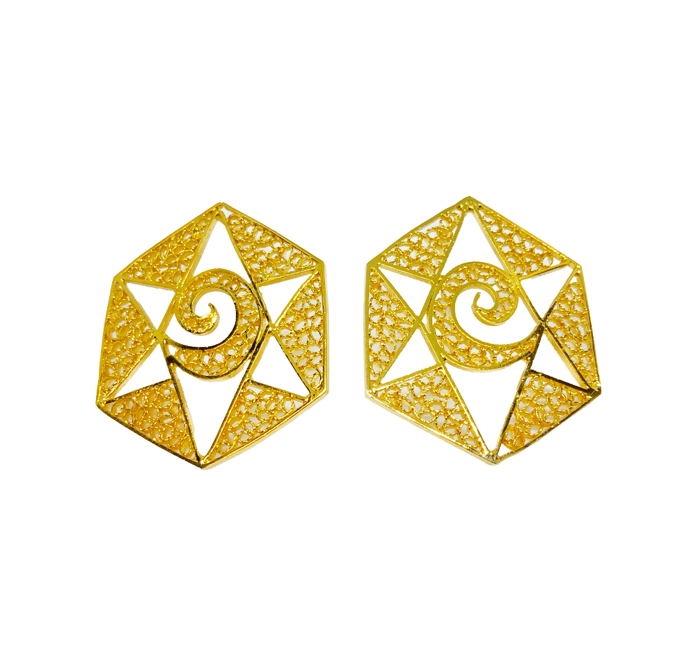 Bronze and copper threads with 24k gold plating. Crafted using 100% handmade filigree technique.