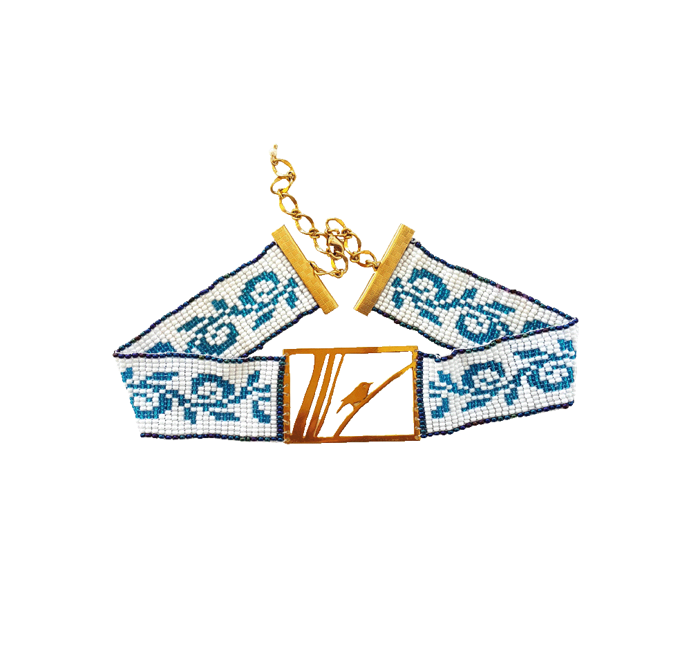 Choker woven with seed beads, with a bronze buckle pierced with gold plating, entirely handmade on a loom. Inspired by nature, its flowers and fauna, it reflects a delicate landscape of it.