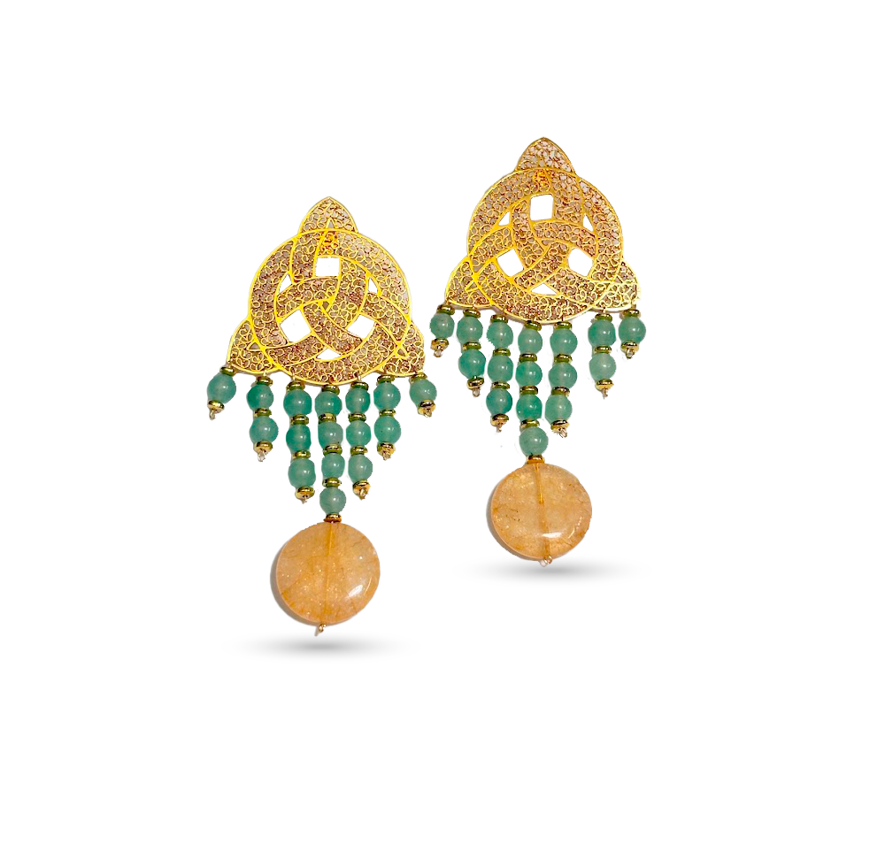 Earrings in the shape of a triskele with aventurine and citrine stones. Filigree technique crafted in bronze and copper with 24k gold plating. The triskel or trinity is a symbol of balance between mind, body, and soul, featuring aventurine and citrine stones for protection and abundance.