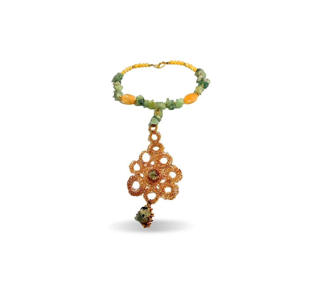 A necklace made with aventurine and citrine stones, featuring a pendant woven with copper thread and plated with 24k gold using a crochet weaving technique. Aventurine and citrine are stones of protection and prosperity.