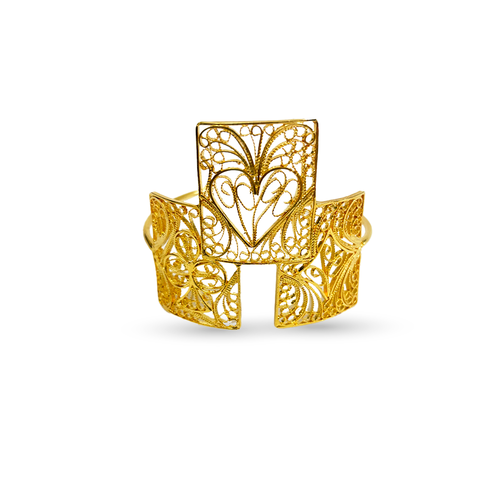 Bracelet featuring heart, clover, and spade symbols in filigree technique, made of bronze and copper with 24k gold plating. The spade, clover, heart, and diamond are part of the Gypsy mystique.