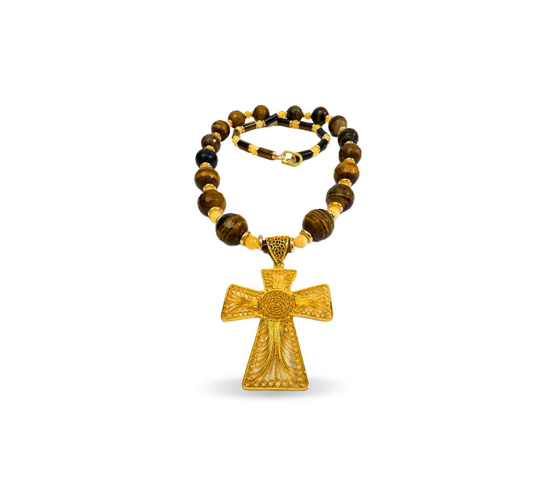 Necklace with tiger’s eye and citrine stones (stones of protection and energy regeneration), featuring a filigree cross pendant in bronze with copper and 24k gold plating. 100% handmade.