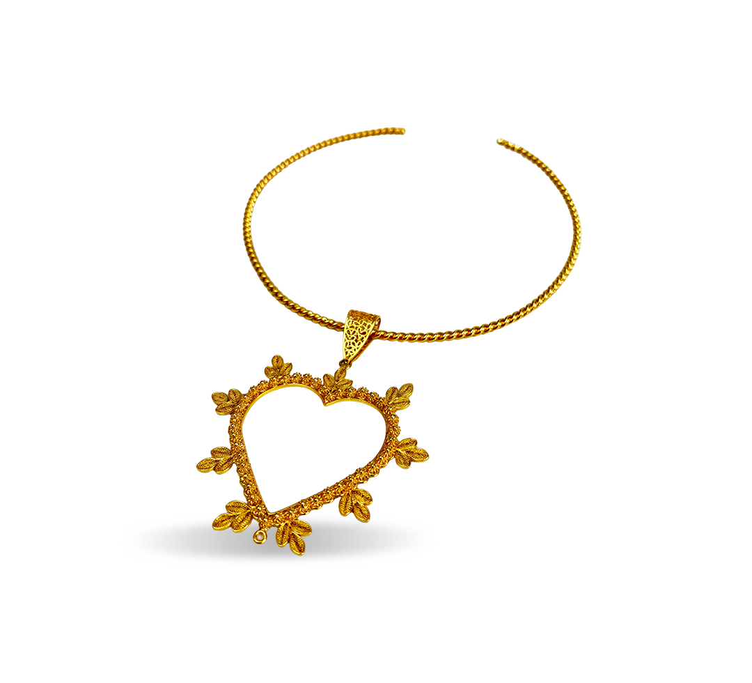 This choker features a heart design adorned with tomatillos, crafted using the delicate filigree technique and plated in 24k gold.