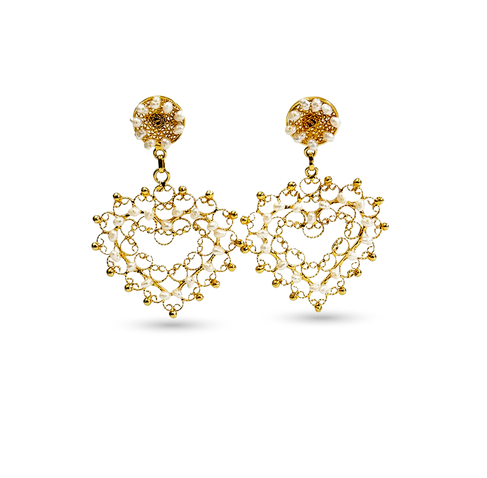 Heart-shaped earrings with beads in bronze and copper, crafted using the filigree technique and plated with 24k gold. 100% handmade.